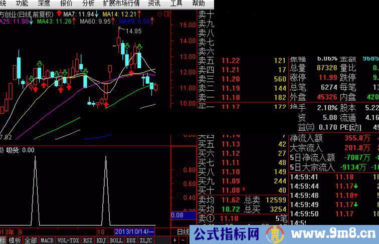 总手:=VOL; ZZ:=IF(REF(C,1)>REF(O,1) AND O>REF(C,1)*1.014 AND C V5:=MA(V,5); V12:=MA(V,12); V34:=MA(V,34); C6:=MA(C,6); 吸货:CROSS(C,C6) AND V>V5*1.2 AND V>V12*1.2 AND ZZ>2 AND C>H*0.975;