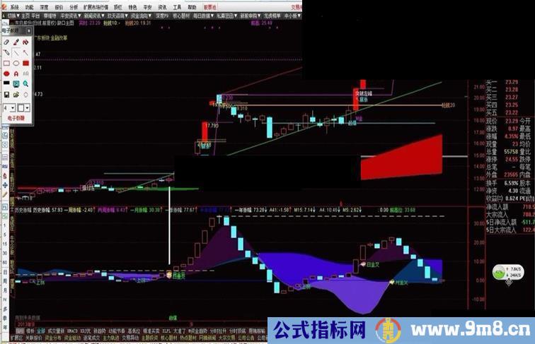 DRAWKLINE(M2*(1+上影线),REF(M2,1)*(1+(O-REF(C,1))/REF(C,1)),REF(M2,1)*(1-下影线),M2);