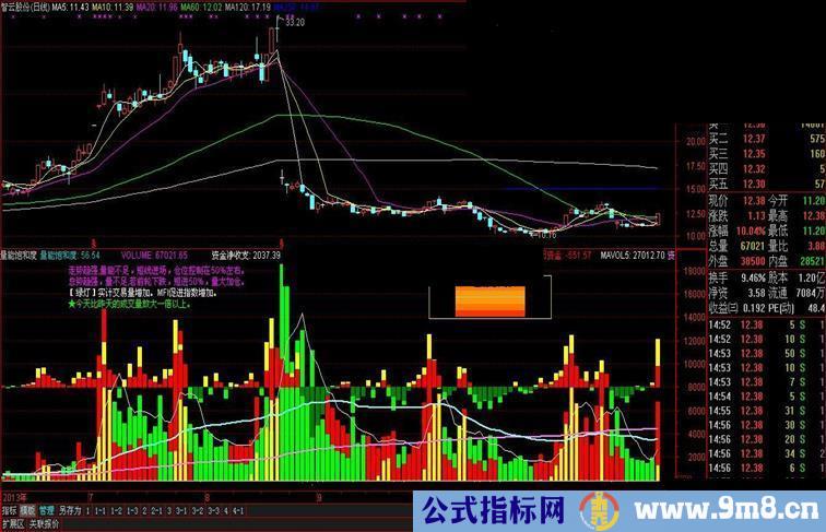 4、量能饱和度说明主力当天的意愿如何?超过50%为强,量能饱和度越大,资金进入意愿越强,上涨的概率越大。