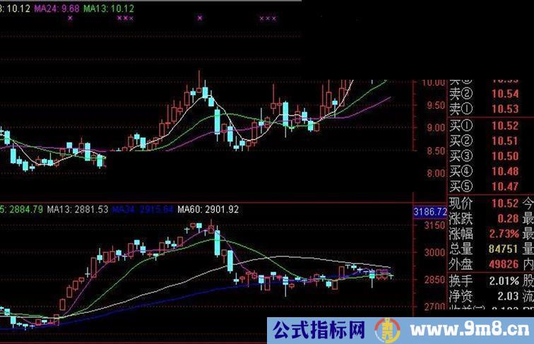 DRAWKLINE("999999$H","999999$O","999999$L","999999$C"); 上证:"999999$C",COLORWHITE,NODRAW; _±:"999999$C"-REF("999999$C",1),COLORLIGRAY,NODRAW; MA5:MA(上证,5); MA13:MA(上证,13); MA34:MA(上证,34); MA60:MA(上证,60);