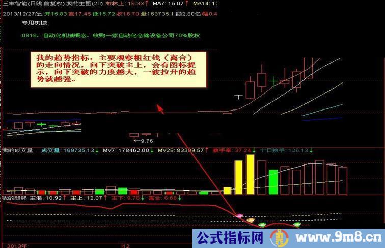 我的趋势指标:主要观察粗红线(离合)的走向情况,向下突破主上,会有图标提示,向下突破的力度越大,一波拉升的趋势就越强。