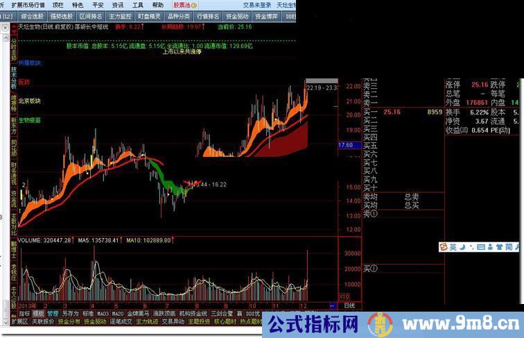 多空趋势彩带:DRAWBAND(SMA(C,6.5,1),RGB(255,97,0),SMA(C,13.5,1),RGB(0,128,0));