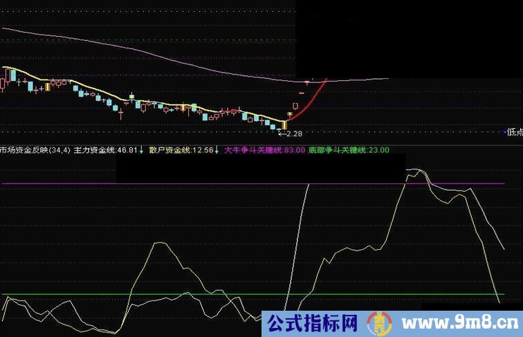 {} 主力资金线: EMA(100*(CLOSE-LLV(LOW,N))/(HHV(HIGH,N)-LLV(LOW,N)),M); 散户资金线: EMA(100*(INDEXC-LLV(INDEXL,N))/(HHV(INDEXH,N)-LLV(INDEXL,N)),M); 大牛争斗关键线: 83; 底部争斗关键线: 23; n 1 250 34 m 1 250 4