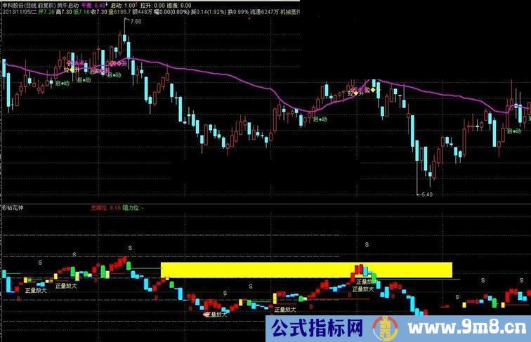 DRAWTEXT(C>REF(C,1)*1.02 AND V/REF(MA(V,5),1)>2,L*0.98,'正量放大'),COLORYELLOW;