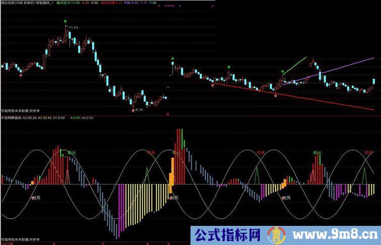 买点: STICKLINE(VAR6>REF(VAR6,1) AND VAR6>0 AND VAR8<0,VAR6,VAR8,4,0),COLOR0099FF;