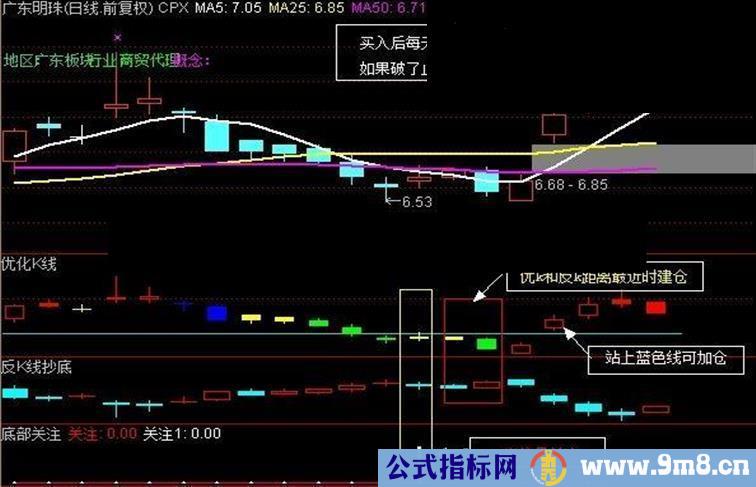 2.底部关注出现白柱信号后,不要急着买,等优化k线的低点和反k线的高点靠近的时候在介入;