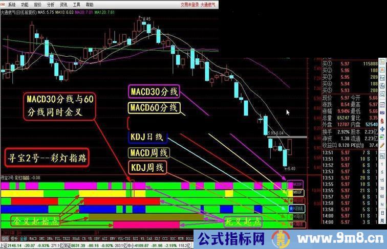 从图中可以看出,这组彩灯分别是由:MACD30F、60F、日线、周线及KDJ日线和周线;