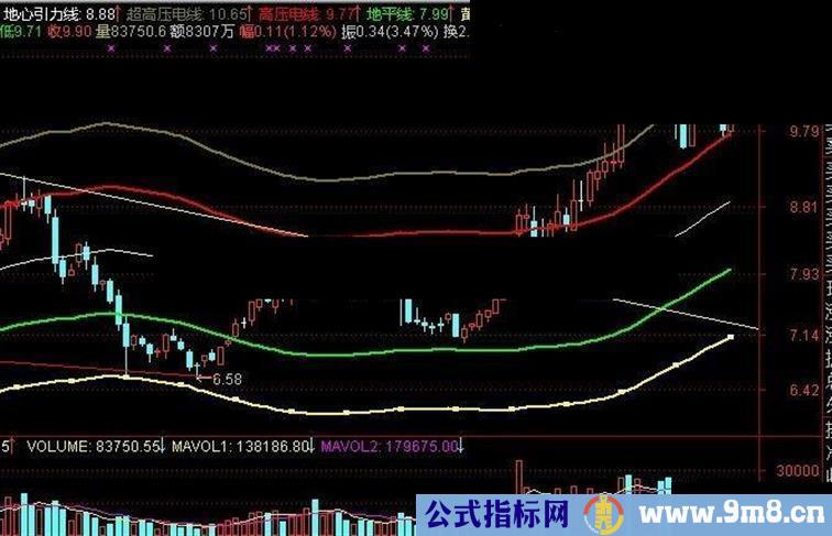 此公式为主图模式,5线之间各间隔10%。股价始终围绕地心引力线做上下波动;股价跌破地心引力线且该线下行为下降趋势;反之为上行。在一轮恐慌性跌势中,若股价跌至最底下的黄线附近为超跌,可大胆买进做多