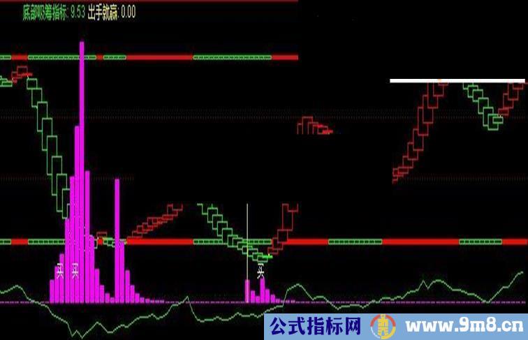 底部吸筹指标: (CLOSE-MA(CLOSE,40))/MA(CLOSE,40)*100, COLOR00FF00;