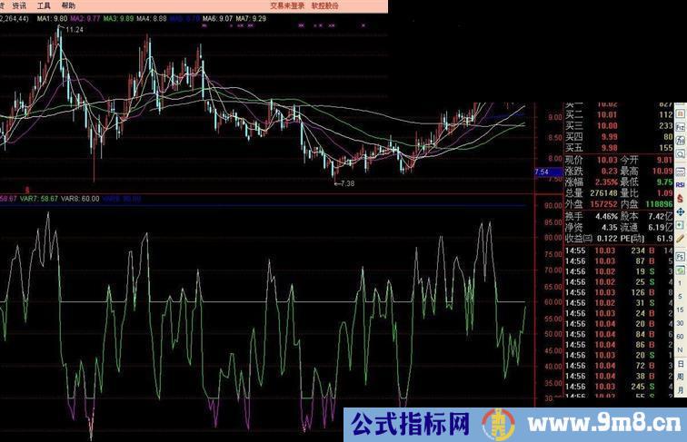 VAR4:((SMA(MAX((CLOSE - VAR3),0),6,1) / SMA(ABS((CLOSE - VAR3)),6,1)) * 100);