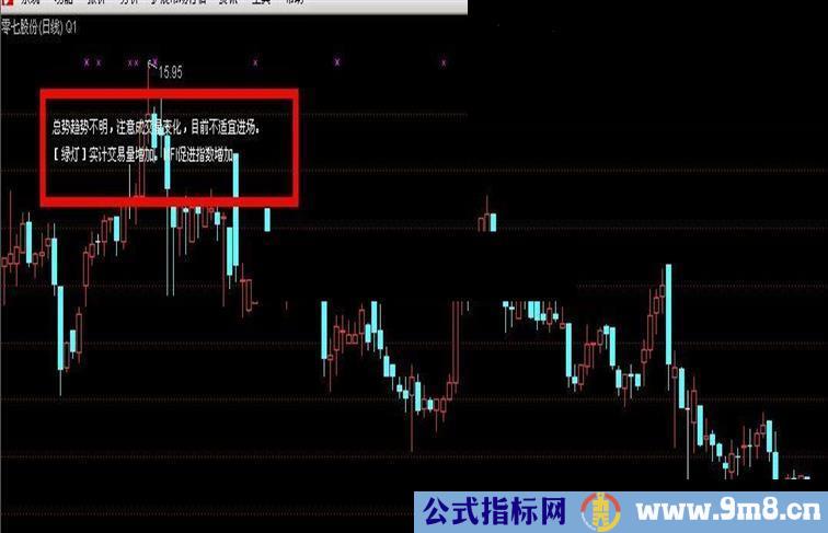 DRAWTEXT_FIX(大盘7,0.06,TS23,0,'总势趋势不明,注意成交量变化,目前不适宜进场。'),COLORFFFFFF;