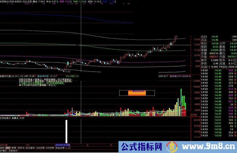 2、买入后股价会出现上涨,当某天出现成交量明显放量,是前一天的五倍以上时,第二天视情况减仓或清仓。