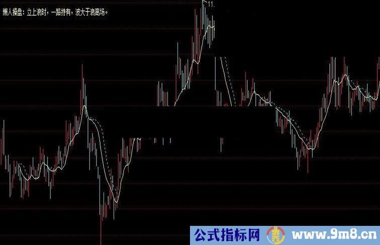“五一”遐想:懒人思路,莫管对错,单线买,双线卖。 (此简式仅作抛砖引玉,不再赘述。) 波:MA(C,13)+ABS(MA(C,13)-REF(MA(C,13),3))COLORFFFF00,DOTLINE; FS:=MA(C,13)+MA(C,13)-REF(MA(C,13),3); 浪:IF(MA(C,13) DRAWTEXT_FIX(1,0.015,0.03,0,'懒人操盘:立上浪时,一路持有,波大于浪离场。')COLORA0FFFF;