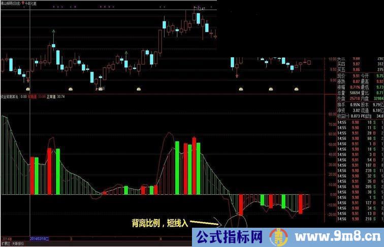 0,COLORYELLOW;ZJX1:=EMA(100*(CLOSE-LLV(LOW,100))/(HHV(HIGH,100)-LLV(LOW,100)),13)/4;ZJX2:=EMA(CLOSE,2)-EMA(CLOSE,89);ZJX3:=2*(ZJX2- EMA(ZJX2,30))*10;ZJX4:=EMA(CLOSE,2)-EMA(CLOSE,150);ZJX5:=2*(ZJX4-EMA(ZJX4,100));背离值:(POW(ZJX3,3)*0.1+POW(ZJX3,2))/45+(POW(ZJX5,3)*0.1+POW(ZJX5,1))*5,COLORRED;正常值:EMA(背离值,5),COLORYELLOW;STICKLINE(正常值>REF(正常值,1),0,正常值,1,1),COLORRED;STICKLINE(正常值<=REF(正常值,1),0,正常值,1,1),COLORGREEN;STICKLINE(CROSS(背离值,正常值),0,正常值*1.2,3,0),COLORRED;STICKLINE(CROSS(正常值,背离值),0,正常值*1.2,3,0),COLORGREEN;