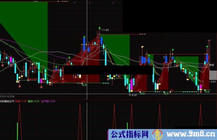 这是一个选股的方法。洋红色柱出现为短期下跌后止跌出现的运气信号;绿色柱出现为较长时间下跌止跌后出现的信号;红色三角是财到信号,可看作财神(是用筹码、乖离、止跌信号共振)。