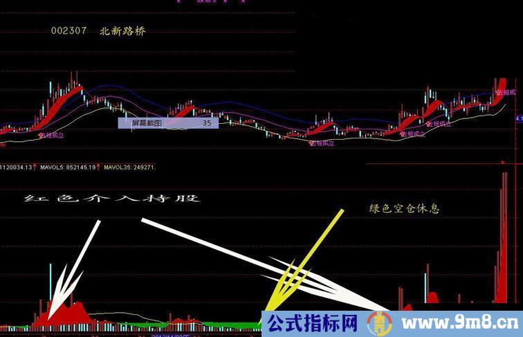 VOLUME:VOL,VOLSTICK; MAVOL5:MA(VOLUME,5); MAVOL35:MA(VOLUME,35); MAVOL135:MA(VOLUME,135); VOLUME5:=MA(VOLUME,5); VOLUME35:=MA(VOLUME,35); VOLUME135:=MA(VOLUME,135); DRAWBAND(MAVOL5,RGB(190,0,0),MAVOL135,RGB(0,160,0));