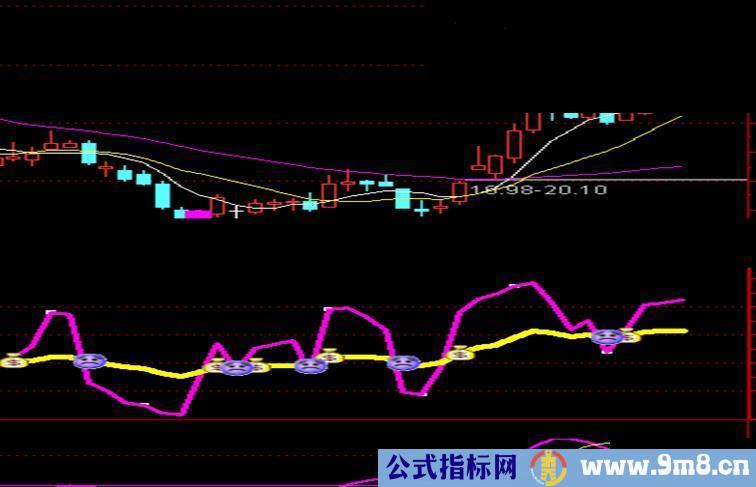 AA:=REF(CLOSE,1); 猎:SMA(MAX(CLOSE-AA,0),3,1)/SMA(ABS(CLOSE-AA),3,1)*100,COLORDD00FF,LINETHICK3; 手:SMA(MAX(CLOSE-AA,0),22,1)/SMA(ABS(CLOSE-AA),22,1)*100,LINETHICK5; DRAWICON(CROSS(猎,手),手,9);DRAWICON(CROSS(手,猎),手,6);