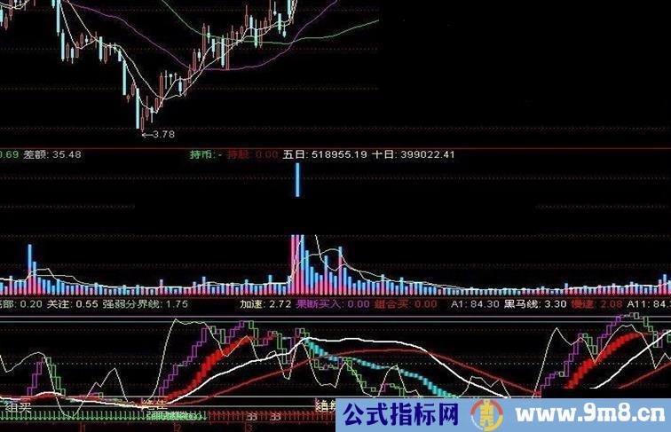 黑马线:EMA(A1,5)/24,LINETHICK2,{COLOR6600FF},COLORWHITE;