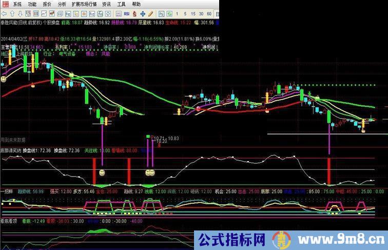 出现红色柱表示阶段底部来到,第二天就可以轻仓打底仓,最好10%仓位,当然结合其他指标可以加大仓位,出现笑脸时可以超过半仓。因为此种底部的出现反弹的概率非常高,不贪心赚个4%出局!当然也可以逐步止盈,进入上升通道再加仓!