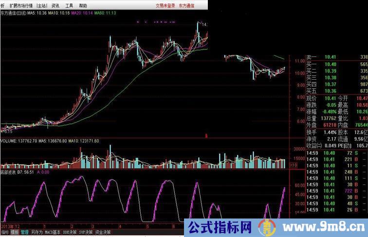 B1:=(HHV(H,9)-C)/(HHV(H,9)-LLV(LOW,9))*100- 70; B2:=SMA(B1,9,1)+100; B3:=(C-LLV(L,9))/(HHV(H,9)- LLV(L,9))*100; B4:=SMA(B3,3,1); B5:=SMA(B4,3,1)+100; B6:=B5-B2; B7:IF(B6>60,B6-60,0); 持有:STICKLINE(REF(B7,1) A:0,POINTDOT,COLORMAGENTA,LINETHICK3;
