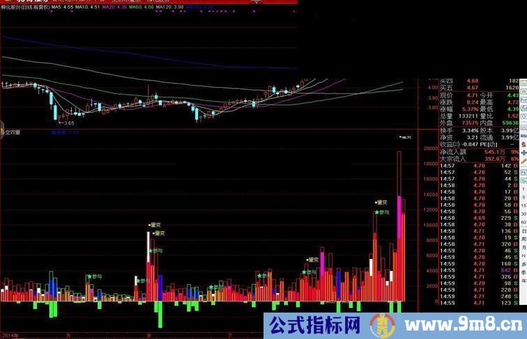 卖盘:=IF((CLOSE > OPEN),(0 - (VAR1 * ((HIGH - CLOSE) + (OPEN - LOW)))),IF((CLOSE < OPEN),(0 - (VAR1 * (HIGH - LOW))),(0 - (VOL / 2))));
