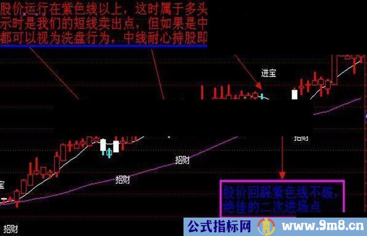 3、当盘面中股价上穿白色线的时候也是我们的短线买入信号之一。当盘面当中出现“招财”提示,同时股价站上紫色线或者白线金叉紫色线,这时是我们最为稳健的中线建仓机会