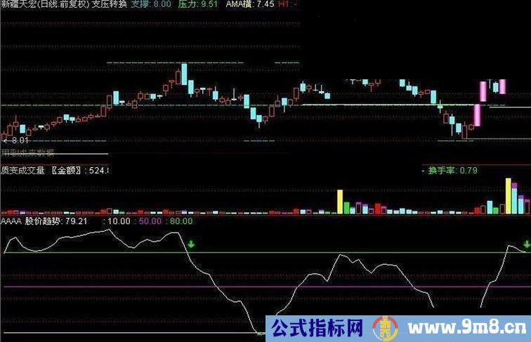 STICKLINE(股价趋势<=10,10,股价趋势,1,0),COLORLIBLUE;