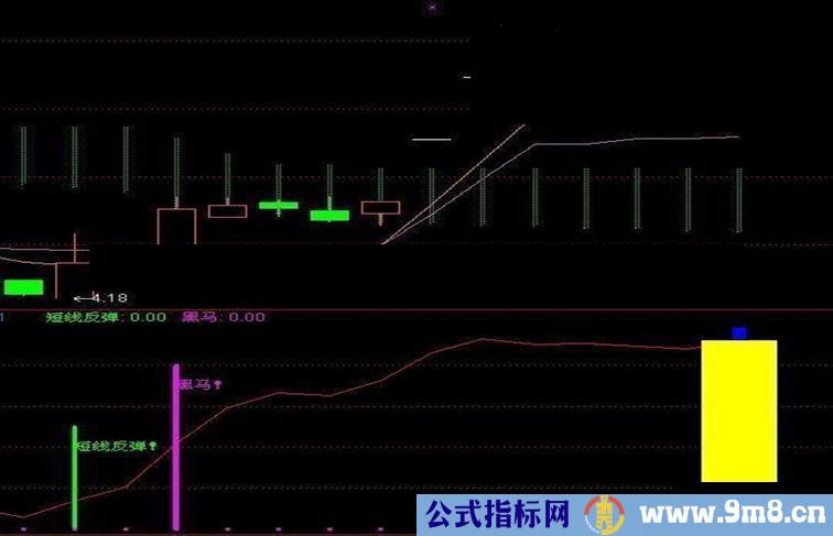 短线反弹:IF(CROSS(个股,9),50,0),STICK,LINETHICK3,COLOR00FF00;