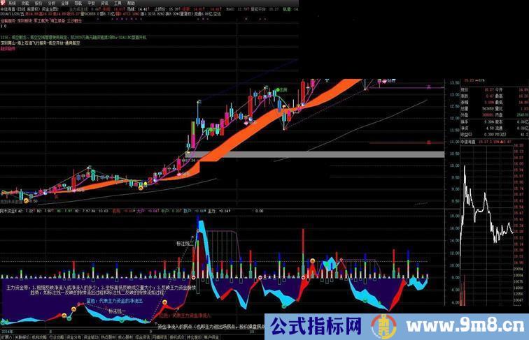 (1).主力资金流入(或流出)带:1.资金带的粗细反映主力资金的流入或流出的多少;2.蓝色带:反映主力资金的净流出和股价下跌或回调的趋势,红色带:反映主力资金的净流入和股价上行的趋势;