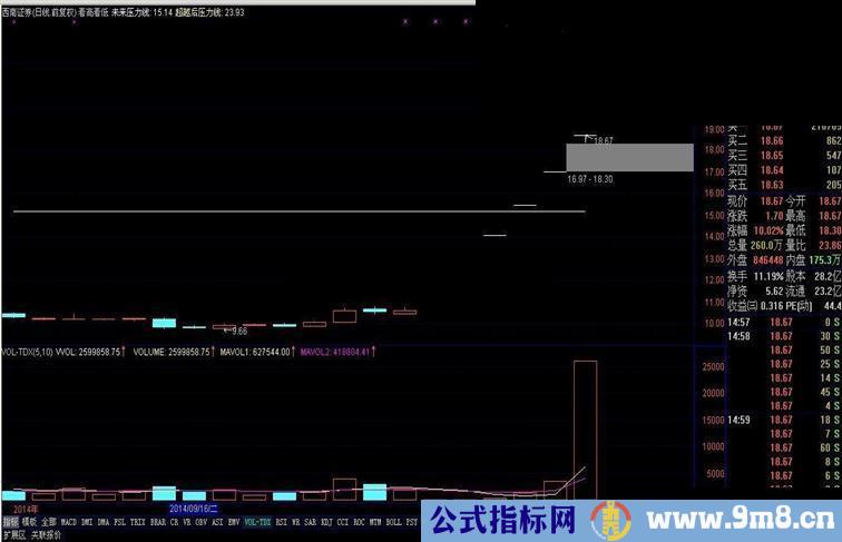 超越后压力线:IF(C>未来压力线,CONST(POW(SQRT(未来压力线)+1,2)),IF(C>未来压力线 AND CURRBARSCOUNT<10,CONST(POW(SQRT(未来压力线)+1,2)),DRAWNULL));
