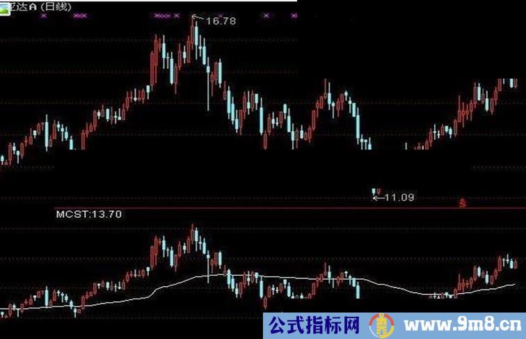 使用说明:当股价在MCST曲线下方翻红时应关注,若向上突破MCST曲线应买入。当MCST曲线的下降趋势持续超过30日时,若股价在MCST曲线上方翻红应买入。