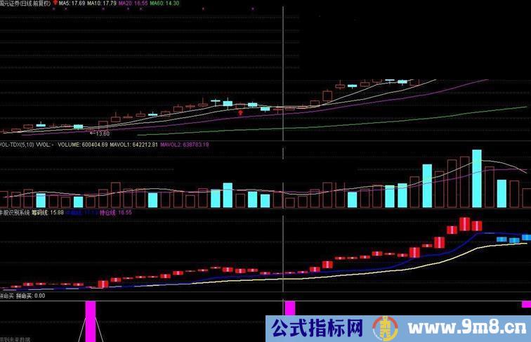 VOLUME:=VOL; 主力启动线:=MA(VOL,5); 主力洗盘线:=MA(VOL,35); 资金异动线:=MA(VOL,135); V1:=CLOSE/REF(CLOSE,3)>=1.03; V2:=BACKSET(V1,2); V3:=REF(CLOSE,3)*1.1; V4:=CROSS(C,V3); 拼命买:IF(V2 AND COUNT(V2,2)=1,1,0); STICKLINE(拼命买>0,0,1,3,0),COLORMAGENTA;