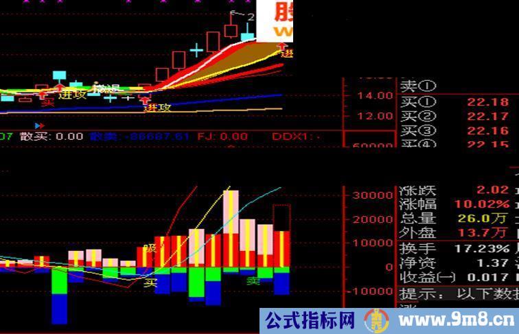 指标引用千钧老师的四分法算法、九散人老师的DDX(带买卖点提示、地量提示),吸筹提示来自理想。
