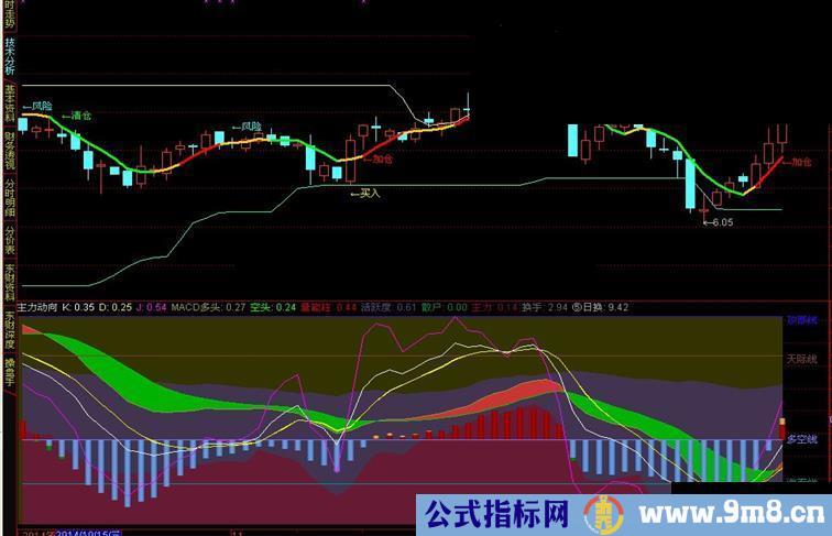 2014即将过去,新年到来之际送自用多年附图指标,同图显示了MACD,KDJ和市场多头能量(主力),空头能量(散户)以及资金活跃度指标,希望没有这个指标的人能够喜欢