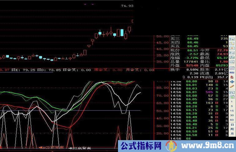 RSI顶背离:STICKLINE(FILTER(D3>0,5),2,1.5,3,0),COLORFF00FF;
