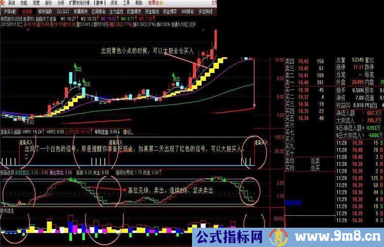 当日K线上出现黄色小点的时候,可以大胆全仓买入,如果接着出现卖出信号后,如果底部还有黄色的小点在,这是主力在洗盘,可以减少一点仓位。直到日K线是出现蓝色的小蓝点后必须清仓,成功率相当高!