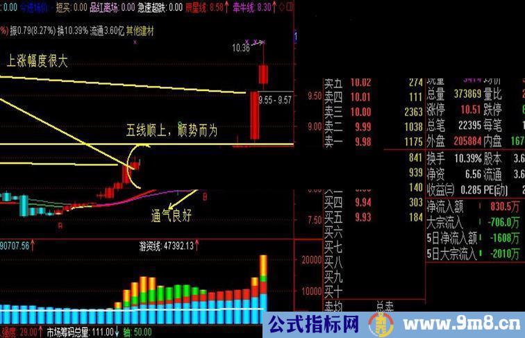(天天进金)模式:1,选股:以量为基础,每天收盘15分钟后下载完整数据,用‘自己专用换手率和量选股’,一般数量不会很多。2,看资金:为自己专用看主力,大户,游资,散户介入使用。注意主力出货也体现出来,要注意甄别。可能很多人也有类似的指标,我想说的是,这仅仅是我自己操作模式的组合之一,每人可以按照自己操作习惯组合。3,看k线,只捉上升趋势,放弃下行股票,这个非常重要。因为我不知道下行股票什么时候是底。4,结合软件其他指标-macd,kdj等配合筛选。
