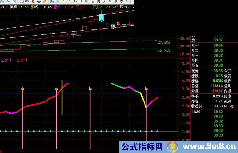 2.黄色区段是过渡,2.5以下的低位区段黄色显示为建仓,3.2以上高位是减仓的信号;