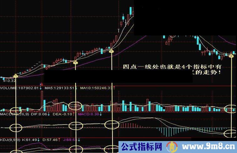 ②、当K 线图上出现信号时,对比股价所处在四个指标的位置,观察有几个指标同时金叉,有几个指标已先于金叉,有几个指标还未金叉或即将金叉,能即时了解股票的当天走势并通过对比做出买卖或持有的判断。