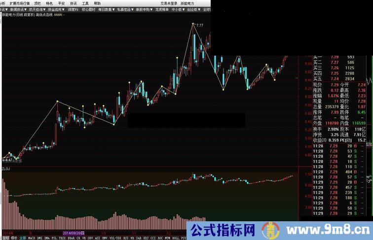 局部低点预选B:=BACKSET(局部低点预选A=0 AND REF(局部低点预选A,1)=1,2); 局部低点预选C:=IF(局部低点预选B=1 AND REF(局部低点预选B,1)=0,-1,0); 局部高点预选A:=BACKSET(HHV(H,5)>REF(HHV(H,4),1),4); 局部高点预选B:=BACKSET(局部高点预选A=0 AND REF(局部高点预选A,1)=1,2); 局部高点预选C:=IF(局部高点预选B=1 AND REF(局部高点预选B,1)=0,1,0); 局部极点A:=局部低点预选C+局部高点预选C; AAAA:IF(局部低点预选C=-1,L,IF(局部高点预选C=1,H,DRAWNULL)) CIRCLEDOT COLORYELLOW; 缺口判断:=IF(L>REF(H,1),1,IF(H