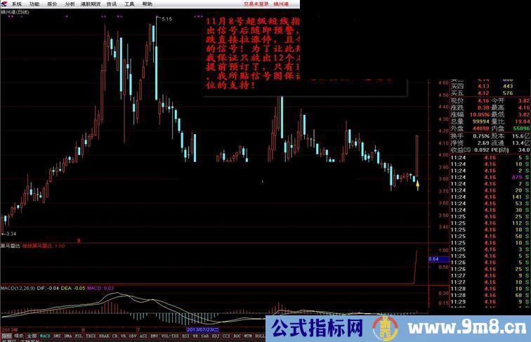 给大家送出的一定是精品,先来看看大盘的情况,从目前的走势来看股指做空的朋友们要笑了,上证指数的大部分均线都被跌破,短期已到2100点整数关口,但这个点位没有什么支撑,结合箱体理论,大盘下一个箱底在2050点。当然到箱底的过程不会那么快,多头还会有不停的抵抗。但在这个过程中仍然会有一些好股票出来,大部分做短线的股民朋友仍然在征战,这当中的风险可想而知,应我的几个忠实粉丝的极力要求,通过一周的编写,一周的实盘验证,今天出炉超级短线黑马雷达指标,96%以上的成功率,不需要从众多股票中选股。只需傻瓜式操作就可以了,这个指标是根据我的炒股风格,结合了MACD指标的信号,同时结合了强势平台突破来综合狙击短线黑马,可以做到超稳,超准,超牛!真正能帮上短线实战的朋友们!假如您拥有该指标就可以做到守若处子,动如脱兔。不出招则已,出招便是一剑封喉!