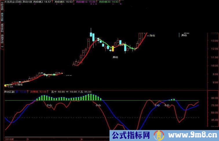 送一组异动指标,请喜欢该指标的朋友在使用时多关注异动K线出现的地方及副图的异动区域,相信守纪律你会有好的收益!