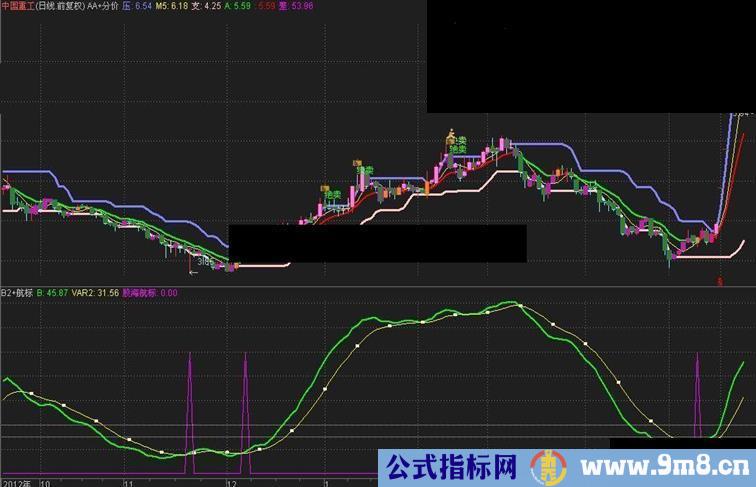 N:=8;M:=5; VAR1:=(CLOSE-LLV(LOW,60))/(HHV(HIGH,60)-LLV(LOW,60))*80; B:SMA(VAR1,N,1),LINETHICK2,COLOR00FF00; VAR2:SMA(B,M,1); 股海航标:IF(CROSS(B,VAR2) AND B<40,50,0);