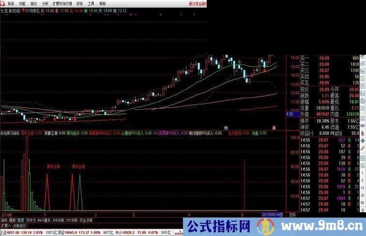 顶天立地:IF(CROSS(趋势,人气) AND (趋势<30),50,0),COLOR0000FF,LINETHICK2;