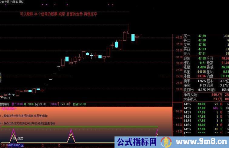 如果信号出现第二天 继续下跌.则可以积极关注.因为主力庄家的操作手法不同. 但是意图不变.而我设计指标的思路就是调整两天.信号就会出现.