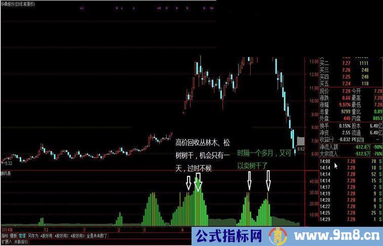2、“松树”——颜色较深,如果出现,代表波段顶,应减持。有些松树还有树干,树干代表波段上的卖点