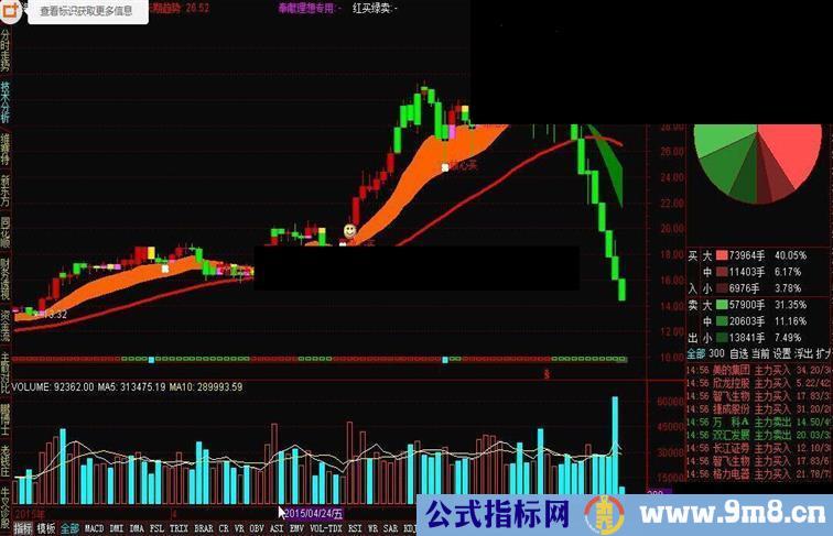 多空趋势彩带:DRAWBAND(SMA(C,6.5,1),RGB(255,97,0),SMA(C,13.5,1),RGB(0,128,0));