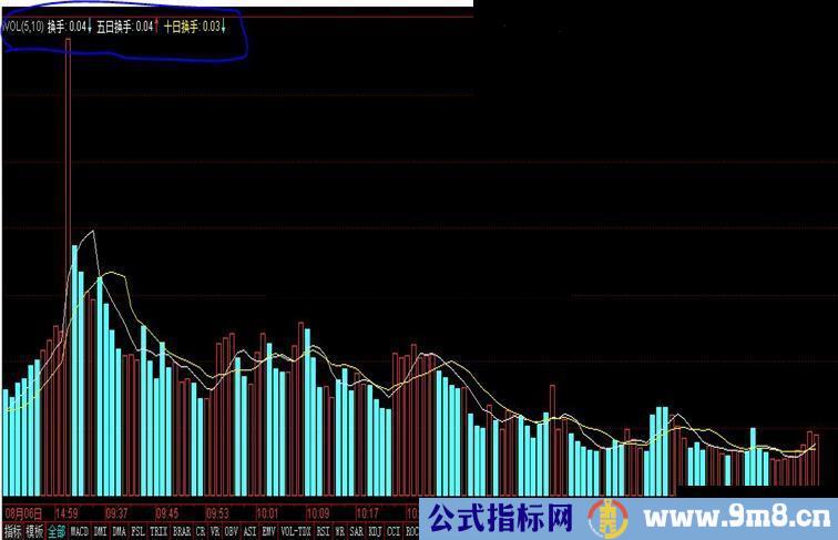 换手:IF(CURRBARSCOUNT=1 AND PERIOD=5,HSCOL*240/FROMOPEN,HSCOL),VOLSTICK;