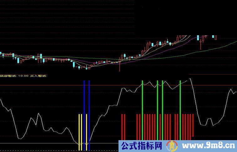 买入警戒: IF(股价趋势<=10,50,0),stick,linethick3,coloryellow;