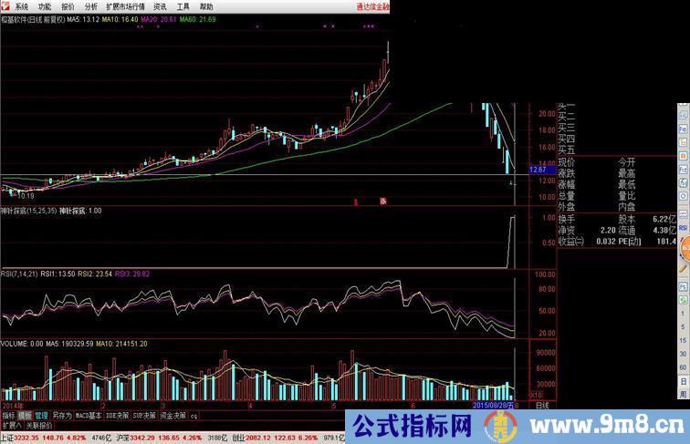 "探底神针"RSI指标具体应用步骤如下: 1、需要将RSI指标的N参数分别设置为7日、14日、21日。 2、当股价经过大幅度的调整走势后,密切观察探底神针"RSI"指标的见底信号,要求7日RSI必须小于10、14日RSI指标必须小于20、21日RSI指标必须小于30。 3、当RSI指标达到上述标准后,如果股价继续下跌,而RSI指标出现明显止跌信号,并与股价走势背离,则需重点关注。 4、如果RSI指标出现7日线上穿14日线和14日线上穿21日线的黄金交叉,并且RSI三线呈现出多头排列,表明RSI指标已经完成了买入信号的提示作用。 5、观察成交量变化。当RSI指标符合上述技术要求时,投资者需要观察成交量的动向。对于成交量的观察有两种:一种是当RSI出现上述技术特征时,成交量是否极度萎缩,甚至出现地量水平。如果成交稀少,则表明该股即将完成探底,投资者可以积极介入。 另一种量能观察是当该股完成探底,投资者及时介入后,则需要观察该股能否出现有实质性增量资金介入的放量过程,如果不能有效放量,则说明目前的底部仍是阶段性底部,投资者需要以短线反弹行情对待。如果该股探底成功后,量能有效持续性地放大,则投资者可以将其视为个股的重要底部,并坚定持股。